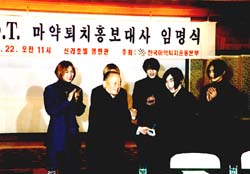 한국마약퇴치운동본부(이사장 민관식)는 22일 신라호텔 영빈관서 인기그룹 H.O.T를 마약퇴치 홍보대사로 임명했다.